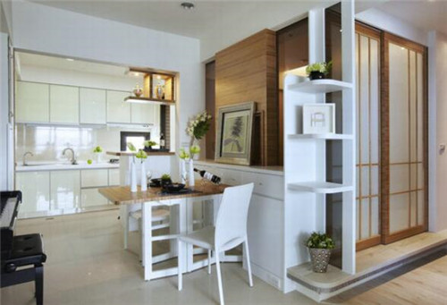 圖中這套房子面積相對(duì)小一些,房主人同樣采取了餐廚一體化的設(shè)計(jì),這樣不會(huì)帶個(gè)人絲毫的擁擠感。半開放廚房把空間界線向后推,達(dá)到放大空間的效果,也透過拉門解決了油煙問題。裝飾色彩的運(yùn)用上也很到位,木質(zhì)的餐廳搭配白色的餐椅,既簡(jiǎn)潔又充滿了溫馨感。